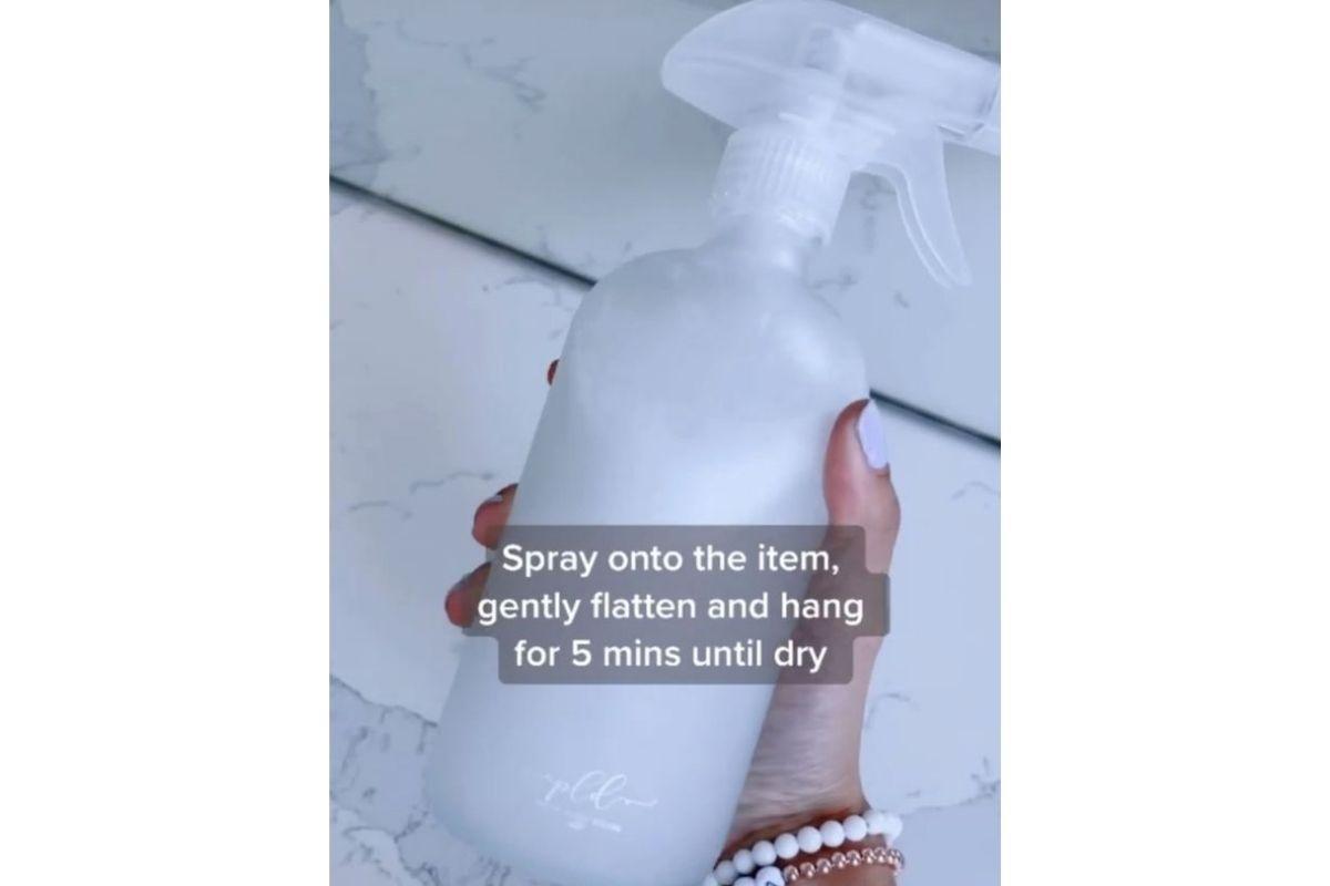 Chantel Mila criou o que chama de spray “anti-rugas” usando apenas três ingredientes, que a maioria das famílias têm em casa. No vídeo, ela aparece explicando que tudo o que você precisa é de dois copos de água, uma colher de vinagre branco (que amacia as roupas) e uma colher de condicionador de cabelo (para relaxar as fibras da roupa).