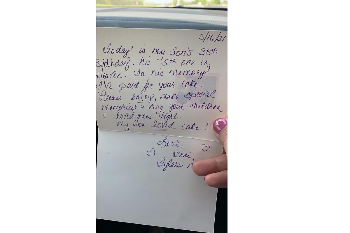Quando Carolyn Mick chegou à loja para buscar um bolo de aniversário para seu filho, ela teve uma doce surpresa ao descobrir que já havia sido pago. Toni deixou um bilhete junto ao bolo em que dizia: “Hoje é o aniversário de 35 anos do meu filho, seu quinto no céu. Em sua memória, paguei pelo seu bolo. Por favor, aproveite, crie memórias especiais e abrace fortes seus filhos e entes queridos. Meu filho adorava bolo”.