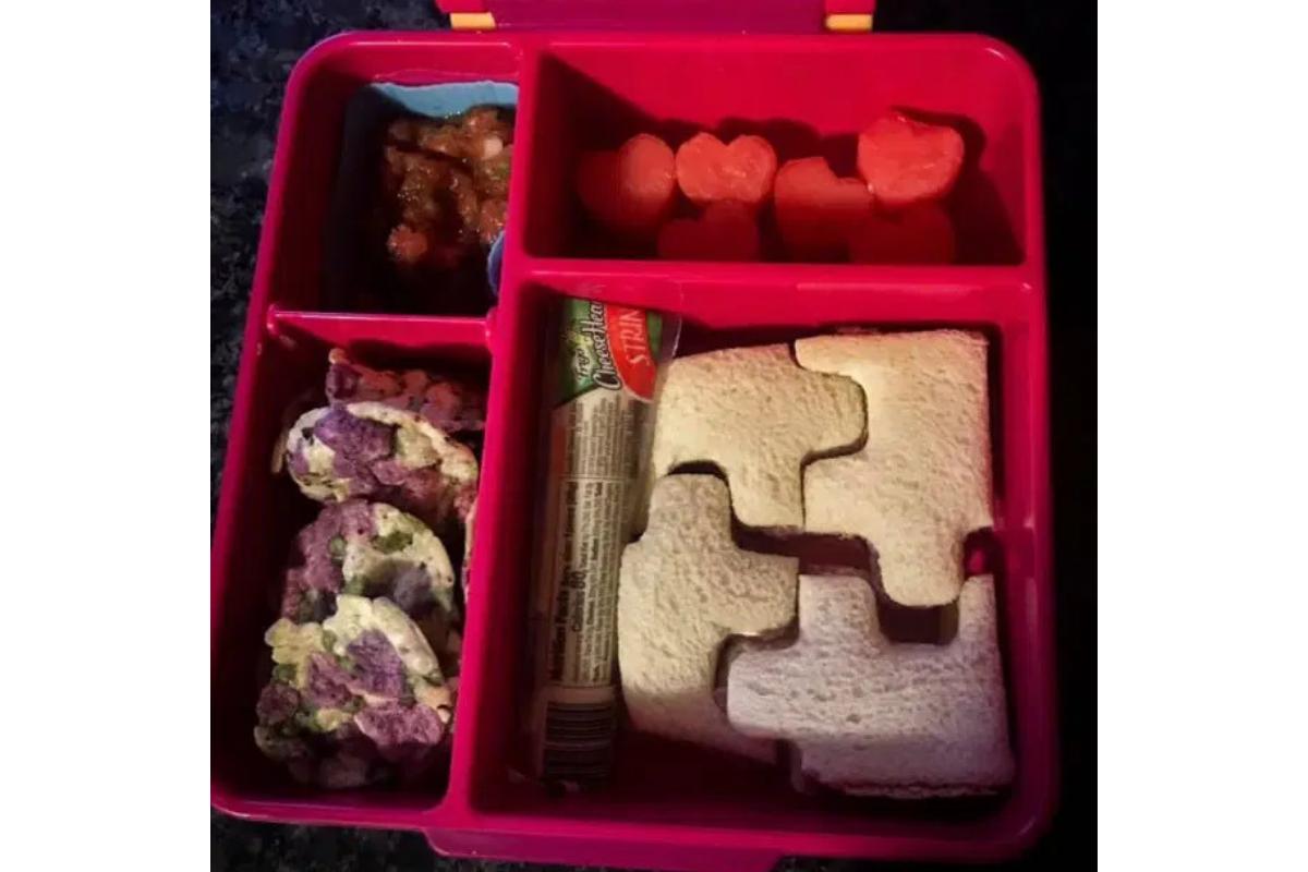 No lugar de um sanduíche normal, ela decidiu dar uma nova cara para ele e cortou o lanche em quatro partes, transformando-o em um quebra-cabeça! Além de todos os outros alimentos que fazem parte do cardápio, ela cortou pequenos pedaços de melancia em formato de coração. Tudo feito com muito cuidado e capricho!