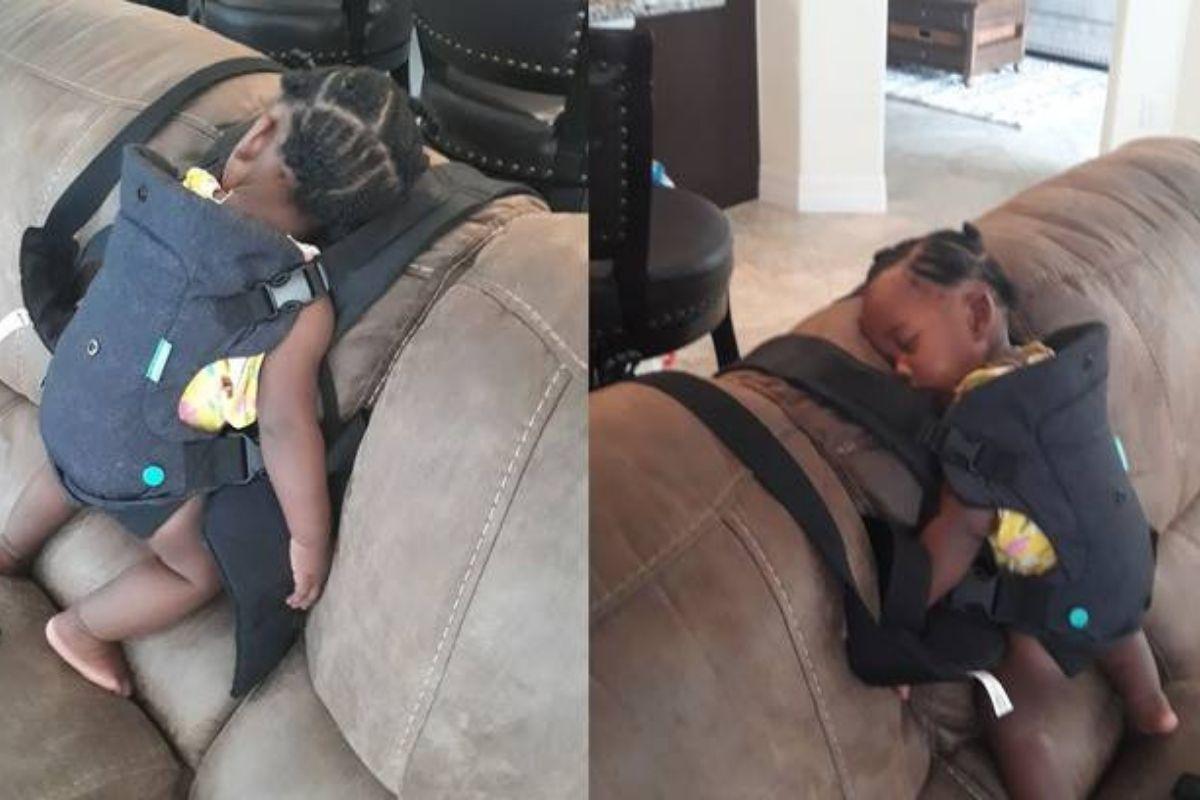 Sheena Turner usou a criatividade para ajudar todos os pais que estão exaustos e precisam de tempo para resolver as coisas. Ela colocou o transportador de bebê encostado no sofá e garantiu duas horas de sono para a filha e a oportunidade dos pais fazerem suas tarefas.