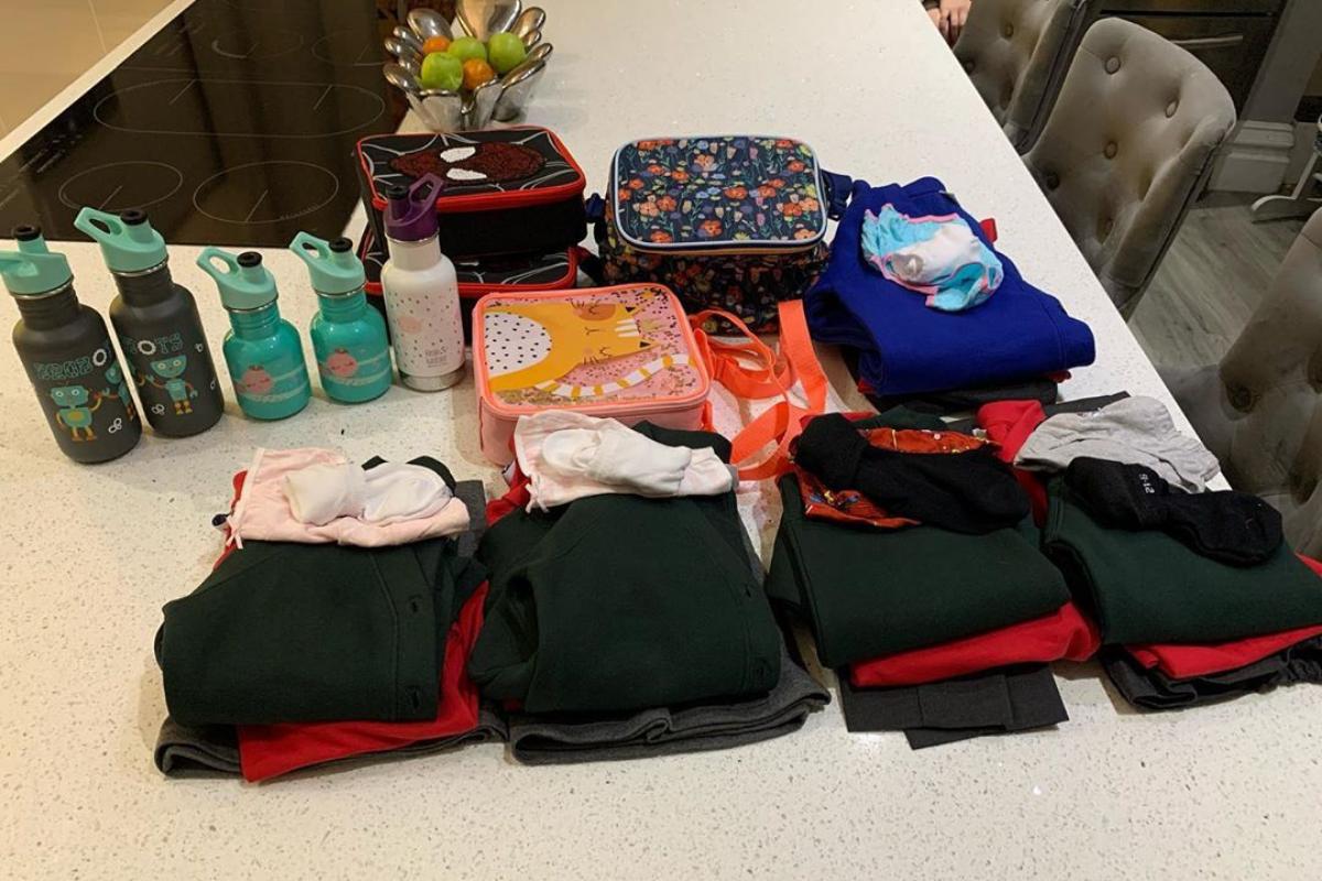 Antes de acordar os filhos, Sue deixou os uniformes de todos separados no sofá, prontos para receber as crianças. Depois do café da manhã e de fotografar todos com os uniformes, é hora de entrar no carro e partir. “As crianças esqueceram qual era o caminho para a escola de tanto tempo que elas ficaram em casa”.