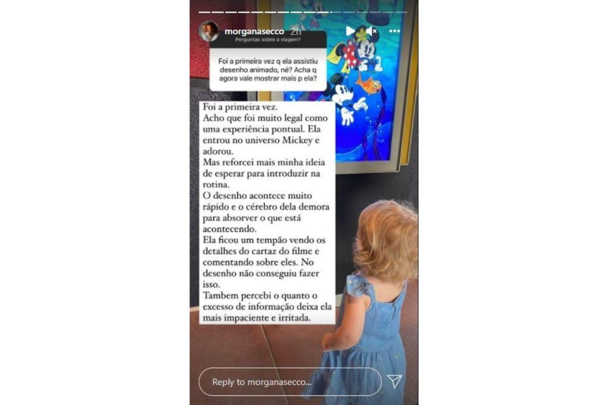 “Foi a primeira vez. Acho que foi muito legal como uma experiência pontual. Ela entrou no universo do Mickey e adorou. Mas reforcei mais minha ideia de esperar para introduzir na rotina. O desenho acontece muito rápido e o cérebro dela demora para absorver o que está acontecendo. Ela ficou um tempão vendo os detalhes do cartaz do filme e comentando sobre eles. No desenho não conseguiu fazer isso. Também percebi o quanto o excesso de informação deixa ela mais impaciente e irritada.”, escreveu Morgana.