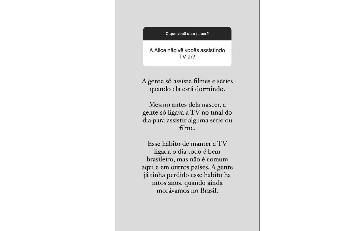 Nos stories do Instagram, Morgana deixou aberta uma caixinha de perguntas com o título: “O que vocês querem saber?” Um dos seguidores escreveu a seguinte dúvida: “A Alice não vê vocês assistindo TV?”