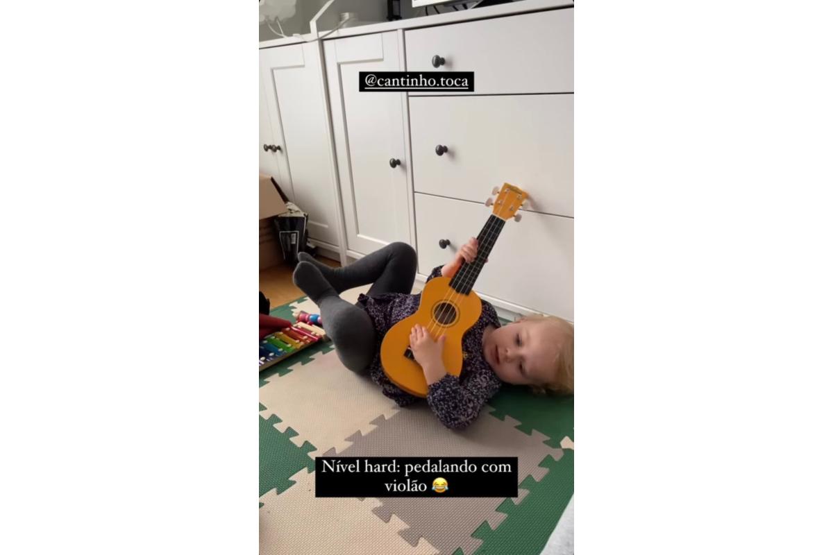 No registro, Alice está deitada segurando o violão e tentando arriscar alguns acordes. “Nível hard: pedalando com o violão”, escreveu a mãe na publicação.