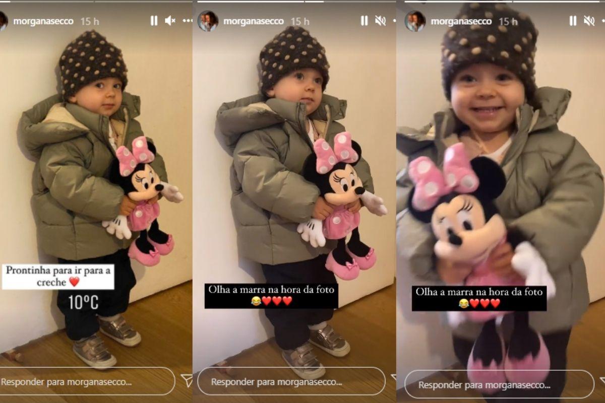 Morgana Secco, mãe de Alice, sempre usa as redes sociais para compartilhar momentos ao lado da filha e as descobertas que a menina tem ao longo do desenvolvimento dela. Nesta quinta-feira (21), publicou uma foto e um nos stories da menina pronta para ir à creche com um look de frio e uma pose cheia de “marra” na hora de bater o clique.