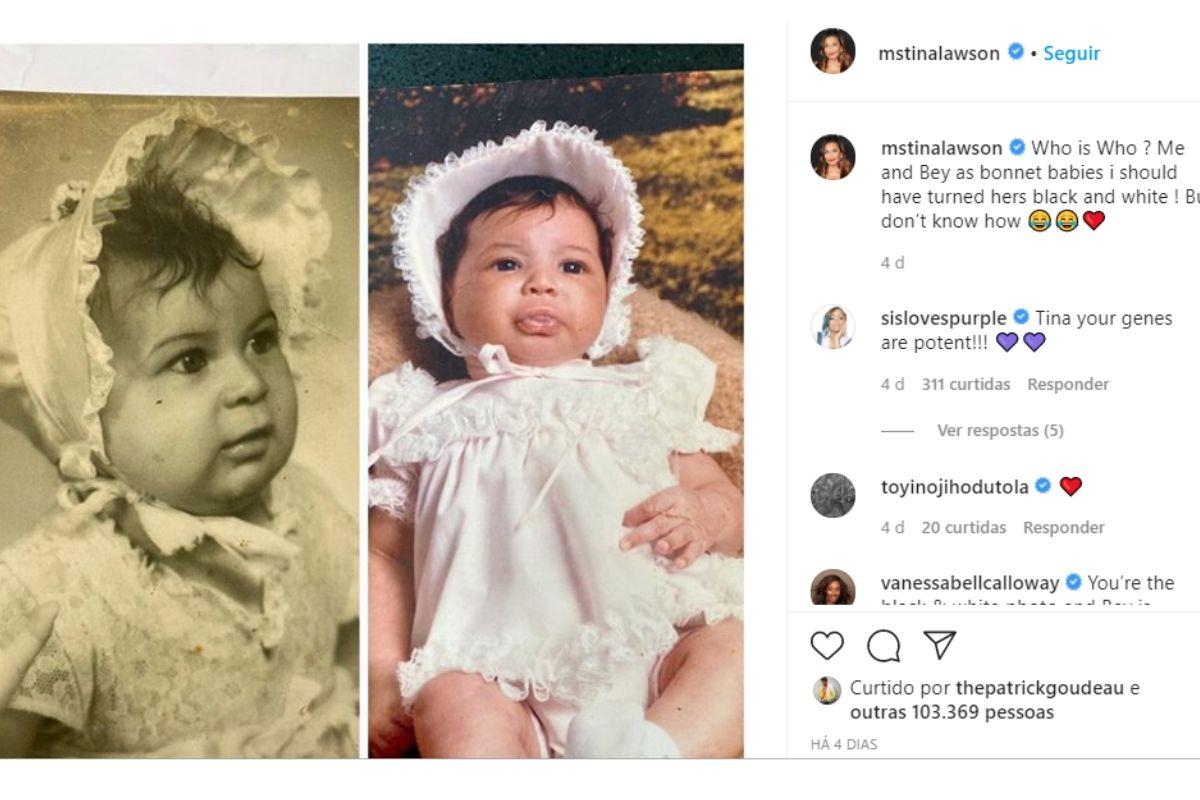 Na última semana, a mãe de Beyoncé, Tina Knowles, chamou a atenção dos seus seguidores no Instagram com fotos de sua infância, que provam que a genética da família não falha. As fotos que mostram Tina quando ainda era um bebê, comparada com sua filha usando a mesma roupa, rendeu muitos comentários e montagens por parte dos fãs. “Quem é quem? Eu e Bey quando éramos bebês!”, escreveu Tina na legenda, de uma das fotos que ela repostou de um fã club.