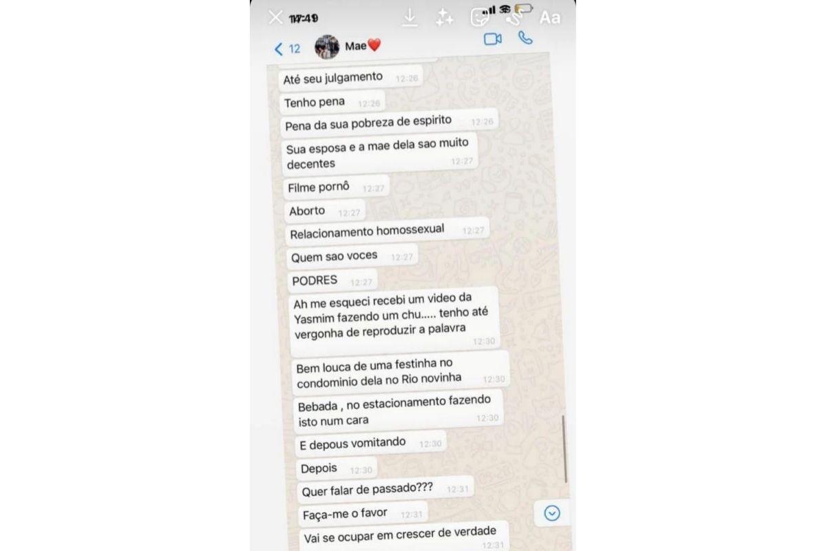 Em um print de uma conversa por Whatsapp divulgado pela coluna do Léo Dias, no site Metrópoles, Simone aparece enviando uma série de mensagens à Gabriel sobre o comportamento de Yasmin no tal registro.