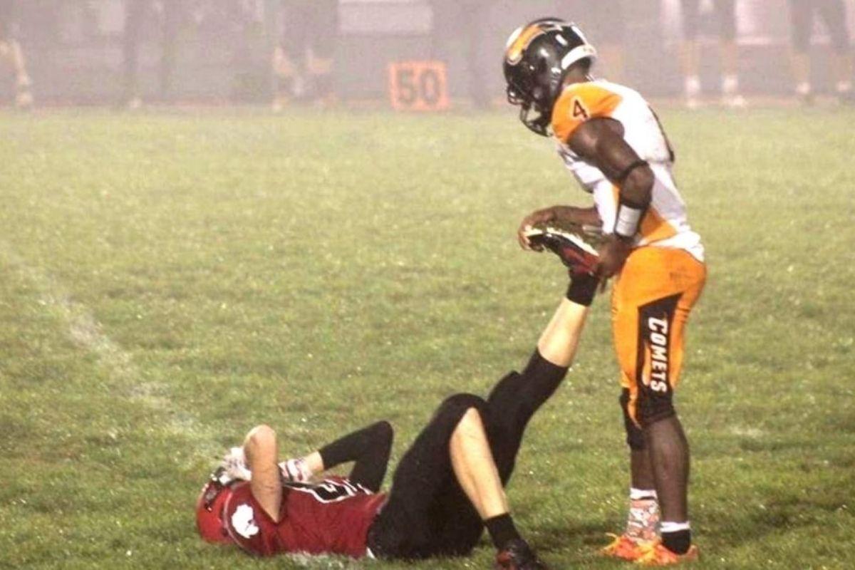 Demais! Mario Hoefer, do time de futebol americano Charles City, não pensou duas vezes para interromper partida e ajudar rival que estava se sentindo mal. Em uma foto emocionante, ele aparece esticando a perna do colega que estava sentindo fortes câimbras.