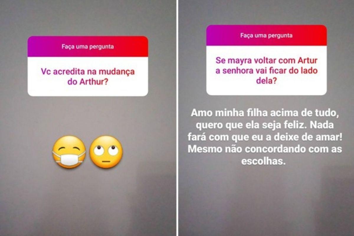 Mãe de Mayra Cardi, Vandha Ramos, comentou sobre a possibilidade de reconciliação da filha com Arthur Aguiar e disse o que pensa sobre a mudança do ex-genro após o término. A empresária respondeu as perguntas em seu Instagram Stories.
