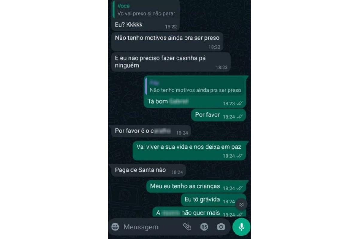 Em um print que mostra a troca de mensagens, ela alerta que ele pode ser preso, mas ele responde que ainda não tem motivos para ser preso. Em seguida ela volta a pedir que ele se afaste da filha, dizendo que ela não quer mais se relacionar com ele. Já em outro trecho, ela afirma que ele já bateu muito nela e pede que ele aceite o fim da relação.