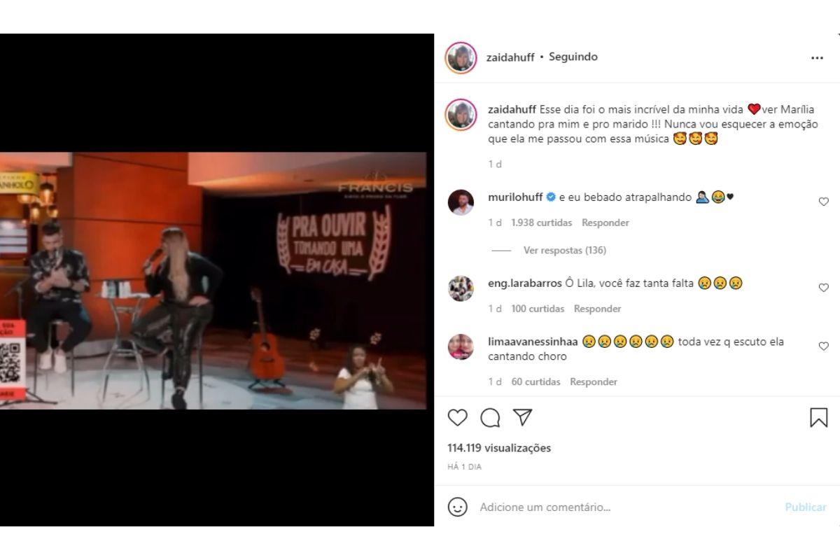 Zaida Huff, mãe de Murilo Huff, usou as redes sociais, nesta terça-feira, 23 de novembro, para publicar uma lembrança de Marília Mendonça. No registro, a artista aparece cantando a música “No dia que saí de casa”, da dupla Zezé Di Camargo e Luciano, com o ex-marido.
