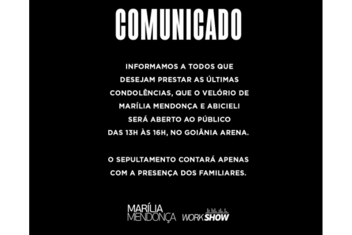“Informamos a todos que desejam prestar as últimas condolências, que o velório de Marília Mendonça e Abicieli será aberto ao público das 13h às 16h, no Goiânia Arena. O sepultamento contará apenas com a presença dos familiares”, informou a assessoria em uma nota compartilhada nas redes sociais.