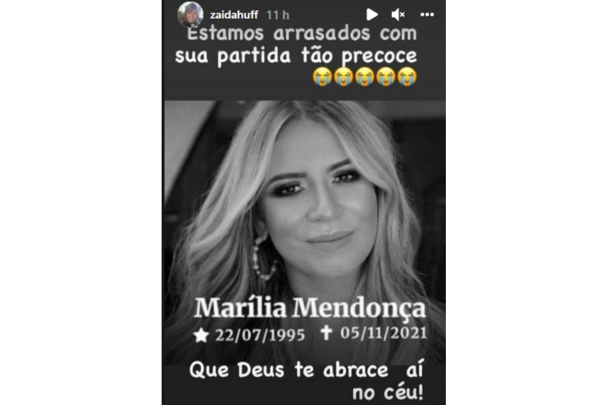 A mãe de Murilo Huff, Zaida Da Luz Huff, se pronunciou pela primeira vez após a morte da ex-nora, Marília Mendonça, que foi vítima de um acidente de avião na última sexta-feira, 5 de novembro. Por meio das redes sociais, a ex-sogra da cantora lamentou a perda.