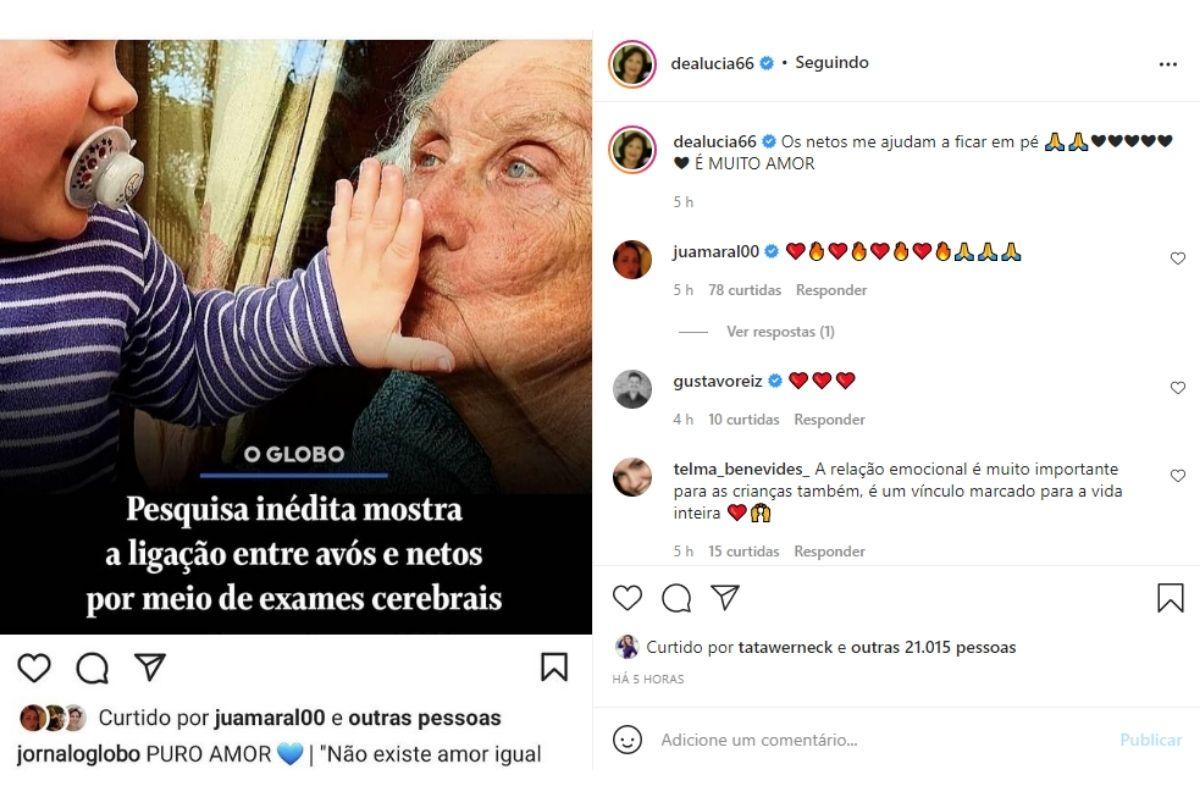 No feed, ela compartilhou uma matéria do O Globo sobre a conexão entre avós e netos. “Os netos me ajudam a ficar de pé. É muito amor”, escreveu ela na legenda do publicação.