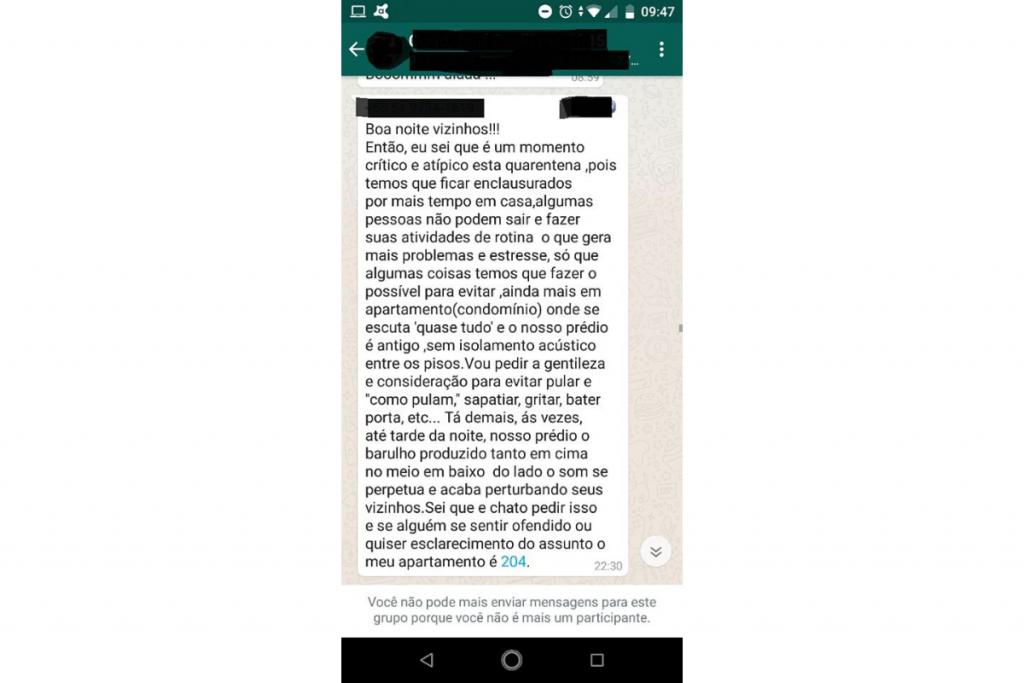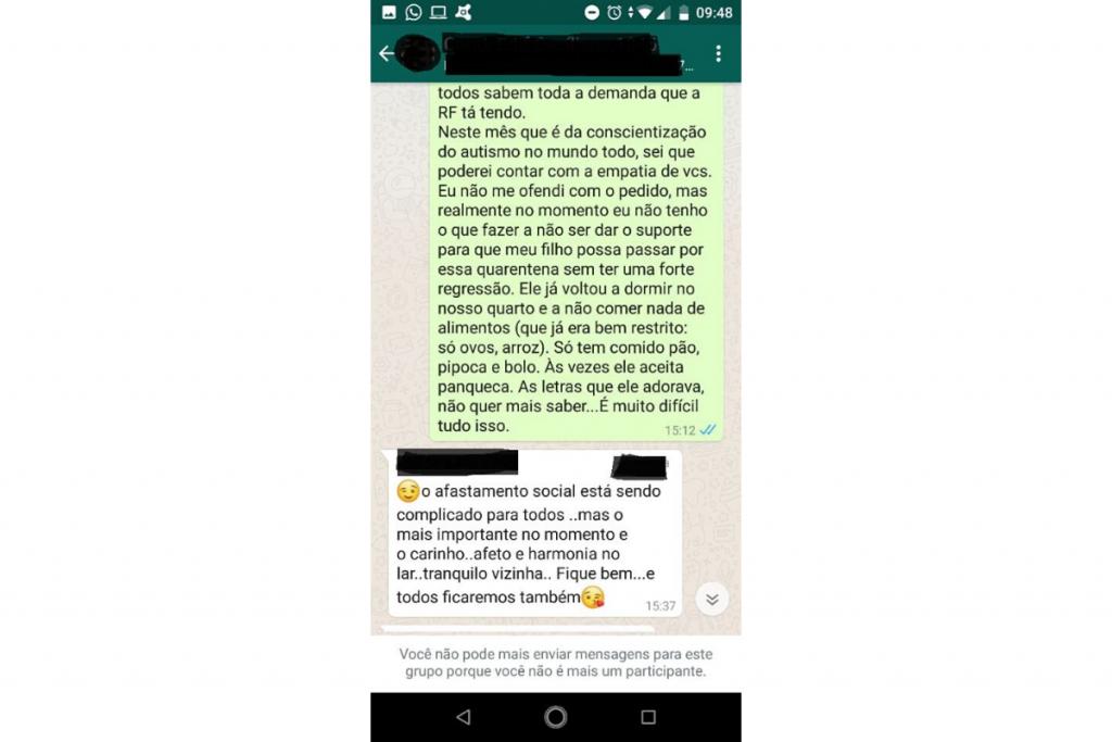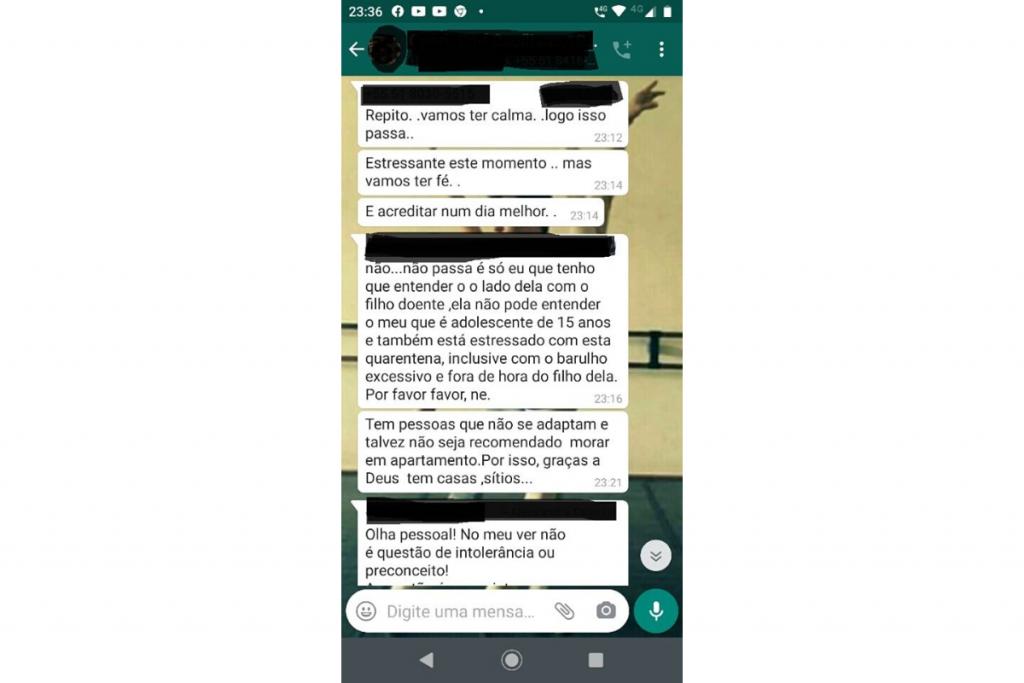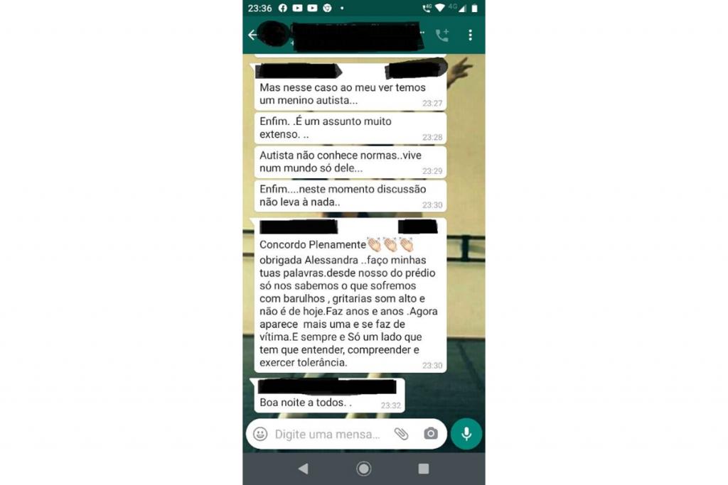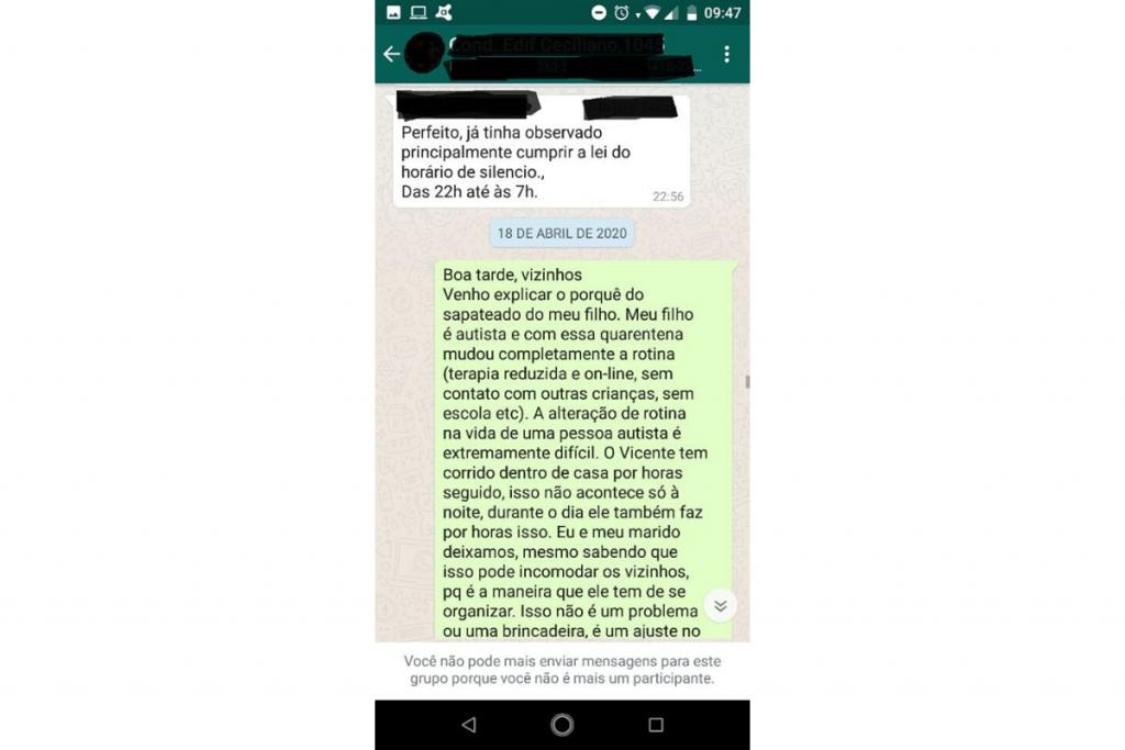 Vanessa conta que os barulhos incomodaram seus vizinhos, que começaram a se manifestar no grupo de WhatsApp do condomínio. Ela então se explicou, falando sobre a condição de Vicente e a maneira como ele tenta não ficar nervoso com a mudança de rotina. Apesar das explicações, muitas pessoas atacaram a família – algumas, além de diminuir o que estava acontecendo, chegaram a sugerir que ela deveria se mudar para um sítio.