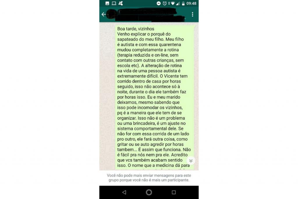 “Com o início da pandemia Covid 19 e todas as ações de cuidados que os governos federal, estadual e municipal estão tomando, a rotina do Vicente foi alterada radicalmente, como de todos nós. Mas alterar uma rotina de uma criança autista sem um mínimo de preparação é extremamente delicada”, ela conta em sua publicação. Ela também disse que, de 12 vizinhos, apenas três pessoas tentaram uma aproximação com a família e o menino.