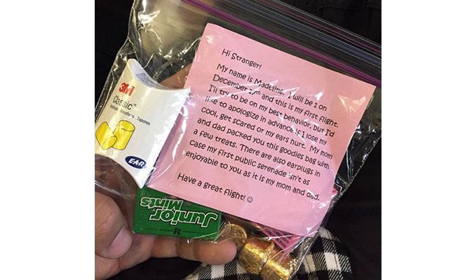 No kit, os passageiros encontram doces, fones de ouvido e um texto. A imagem acima é um exemplo e o texto diz: “Olá, estranho. Meu nome é Madeline. Eu farei 1 ano dia 17 de dezembro e esse é o meu primeiro voo. Vou tentar me comportar da melhor forma, mas eu gostaria de me desculpar caso eu perca o controle, fique assustada ou meu ouvido comece a doer. Meu pai e minha mãe embalaram esse saquinho com alguns presentes. Também há fones de ouvidos caso meu choro não seja tão desagradável para você quanto é para minha mãe e meu pai. Tenha um ótimo voo!” (tradução livre).