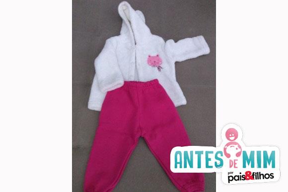 Dentre as histórias, uma ficou marcada para sempre na memória da mãe e tem tudo a ver com a roupa da foto acima. “Minha filha usou essa peça de frio na primeira viagem de avião que fez”, comenta.