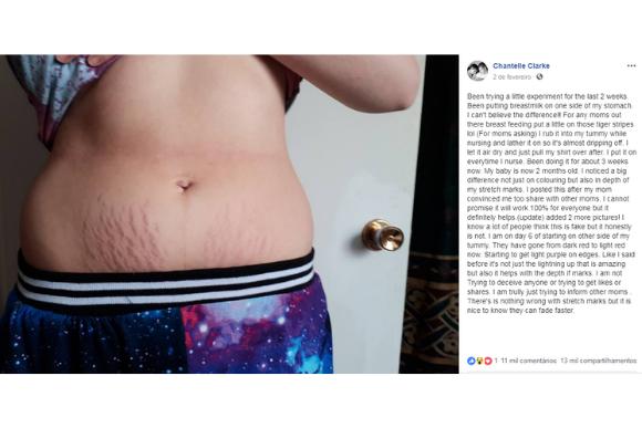 “Eu não pude acreditar na diferença”, conta a mãe surpresa com os resultado (Foto: reprodução/ Facebook)Além de clarear as estrias, o leite materno ajuda na diminuição da profundidade das marcas. “Elas passaram de vermelho-escuro para vermelho-claro agora. Começando a ficar roxo claro nas bordas. Como eu disse antes, não é apenas o clareamento que é incrível, mas também ajuda com a profundidade das marcas” escreveu Chantelle na publicação.