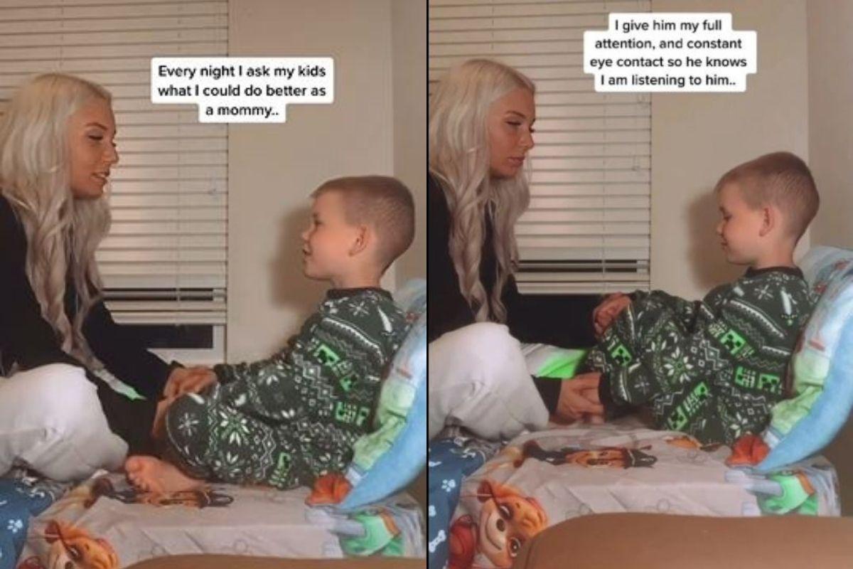 Filmando-se colocando o filho de cinco anos para dormir, Caitlin escreveu: “Todas as noites eu pergunto aos meus filhos o que eu poderia fazer melhor como mãe. Eu escuto o que ele tem a dizer e faço perguntas para ter certeza de que entendi.” No dia em que ela filmou, o filho de Caitlin disse que queria que ela respirasse fundo quando ele estivesse chateado.