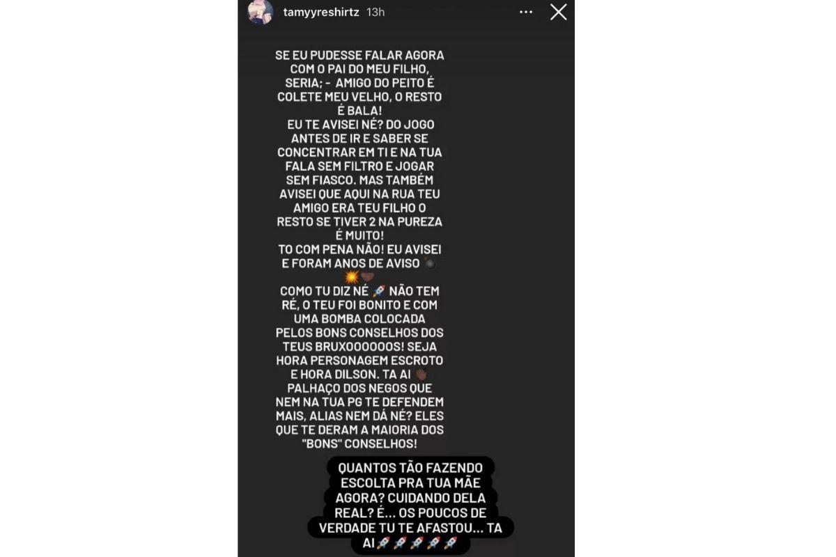 “Quantos estão fazendo escolta pra tua mãe agora? Cuidando dela real? Os poucos de verdade tu te afastou”, finalizou Tamyres, que apagou a publicação horas depois.