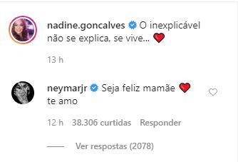 “O inexplicável não se explica, se vive…”, escreveu Nadine na legenda. O modelo também repercutiu a foto em seu Instagram e foi parabenizado pelos seguidores pelo novo relacionamento. Neymar fez questão de demonstrar apoio à mãe. “Seja feliz, mamãe. Te amo!”, escreveu nos comentários da imagem.