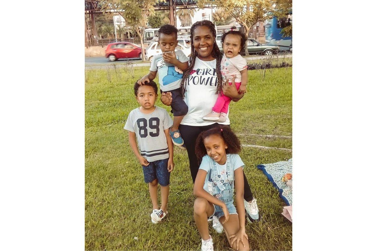 Aline Barbosa, mãe solo de Laura, Vicente, Joaquim e Antônia, é professora e atua como criadora de conteúdo digital no perfil @maecrespa