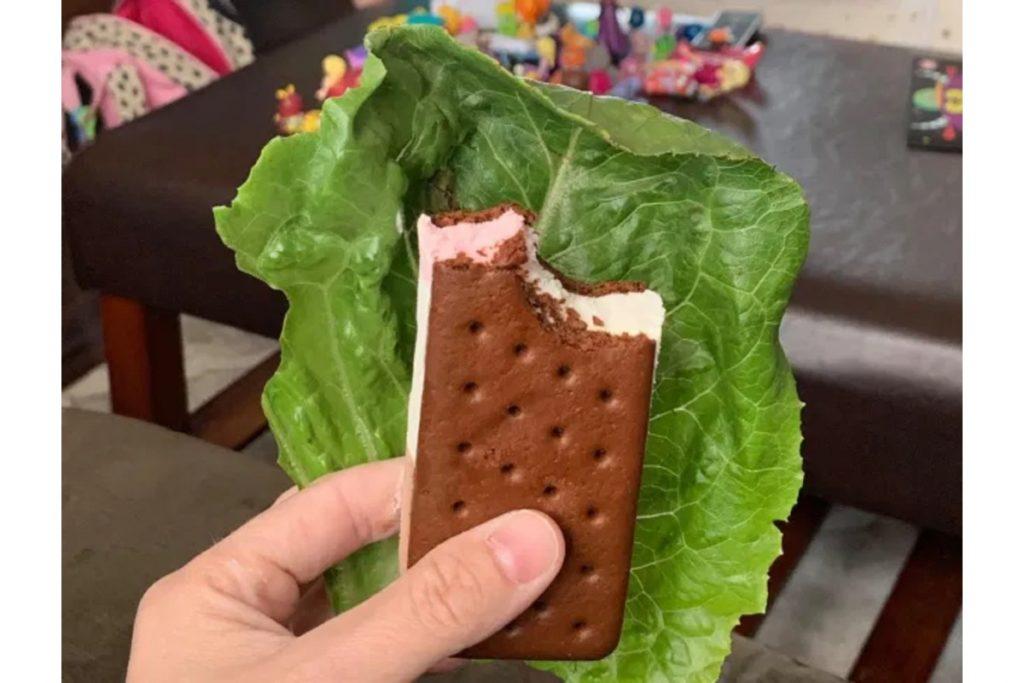 Brooke escondeu o doce atrás de verduras, para que a filha não visse o que realmente estava comendo. Ao ver que havia dado certo, a mãe compartilhou a ideia nas redes sociais com a foto de um sorvete atrás de uma folha de alface.