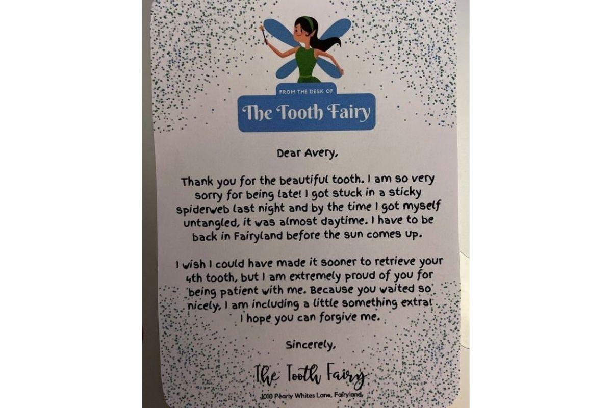 “Querida Avery, obrigada pelo dente lindo. Lamento muito o atraso! Fiquei presa em uma teia de aranha pegajosa ontem à noite e quando me desemaranhei, já era quase dia. Eu tenho que estar de volta ao Fairyland antes que o sol nasça. Eu gostaria de ter conseguido recuperar seu quarto dente mais cedo, mas estou extremamente orgulhosa de você por ter sido paciente comigo”, escreveu a “fada” no bilhete, como apresentado pelo jornal Mirror.