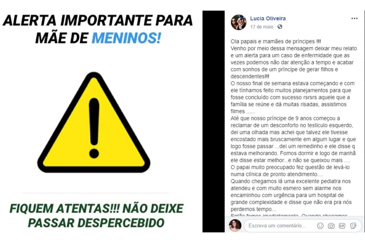 Contente com a boa notícia, mas preocupadas com outras crianças que poderão sofrer com o mesmo problema, Lucia foi até o Facebook relatar tudo que havia acontecido. “Venho aqui fazer um apelo pra quem tem menininho em casa!!! Se seu filho se queixou ou você notou algo diferente nos órgãos genitais, não espere nem um minuto, leve-o imediatamente pra ser avaliado por um especialista. Eu não tinha noção e acho que muitos pais também não tem do que esse “simples’ desconforto pode causar”.