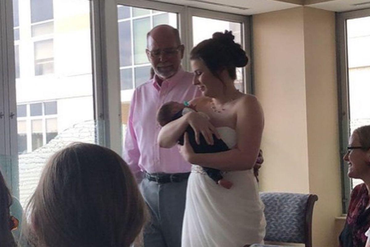 Os dois decidiram se casar, mas apenas em uma cerimônia discreta no tribunal. Disseram à enfermeira que cuidava de Oliver que eles ficariam longe da UTI pré-natal por um curto período de tempo, para que pudessem realizar o casamento. O casal perguntou ao médico de Oliver se ele achava que o bebê estava estável o suficiente para ser retirado dos monitores, já que nasceu prematuro. Com a bênção do médico, Oliver pôde comparecer ao casamento. Em uma rápida “missão”, como a mãe contou brincando, as enfermeiras decoraram o berço de Oliver para que ele pudesse ser levado até a capela do terceiro andar.