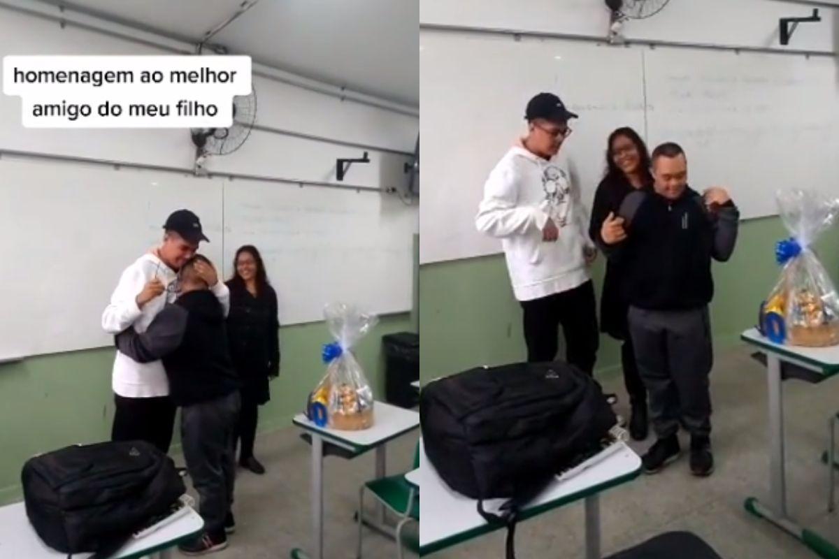 A mãe continua o relato fazendo uma homenagem especial ao Pedro, um dos alunos da sala e melhor amigo de Renan. “Alguém quebrou o protocolo, alguém foi além do protocolo… Eu fiquei sabendo que é uma pessoa muito próxima ao meu filho e que soube receber ele de uma forma diferente, não só pela deficiência, porque o que eu mais espero que as pessoas vejam no Renan não é a deficiência, é o que ele pode oferecer além da deficiência dele”, pontuou ela.