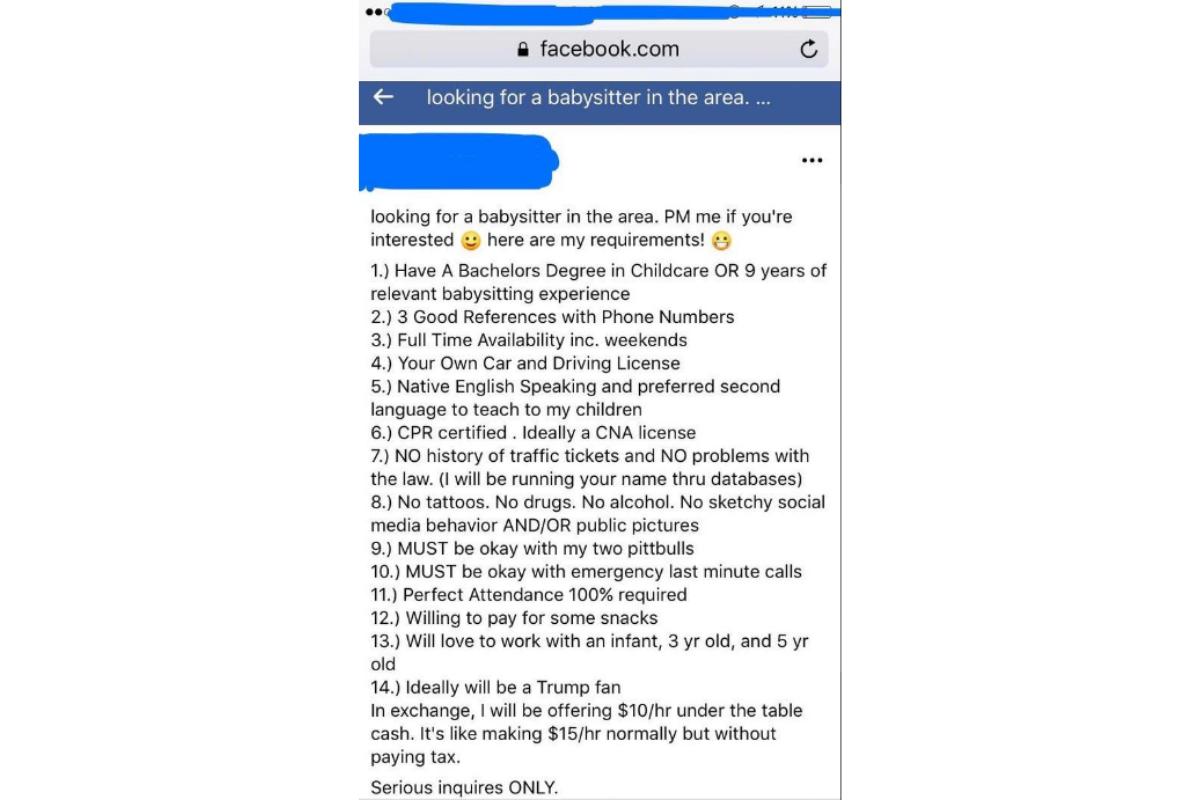 “Procurando uma babá, me mande mensagem se você estiver interessada. Aqui estão minhas exigências: