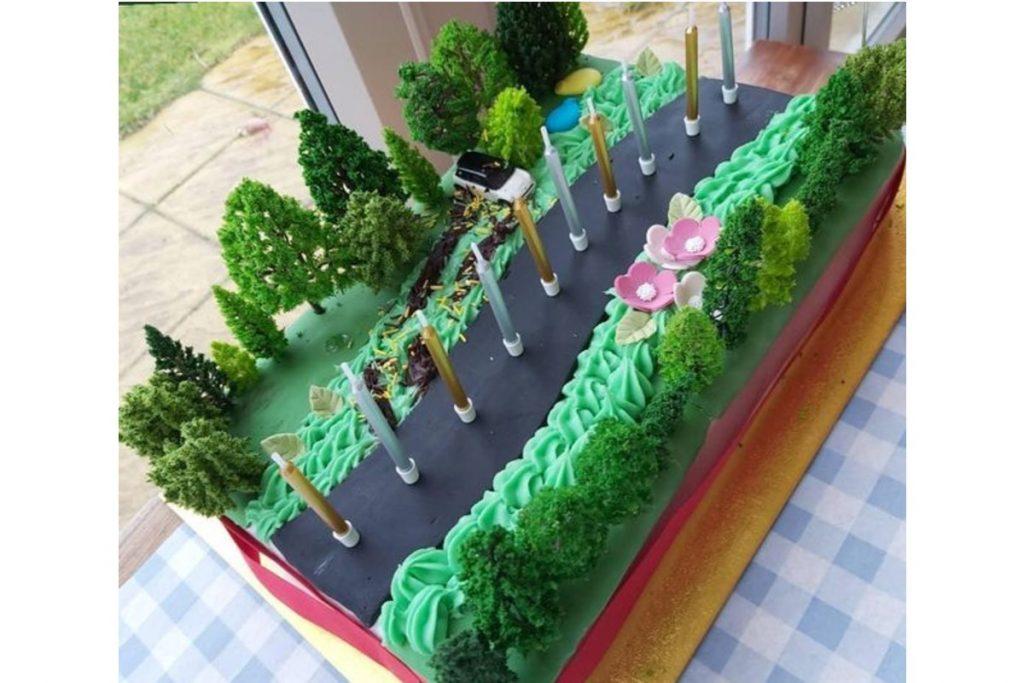O bolo ilustrava como a menina conseguiu destruir seu novo carro. Além de ser uma surpresa para aniversariante, foi para todos os convidados (incluindo o avô), já que a batida havia ficado em segredo.