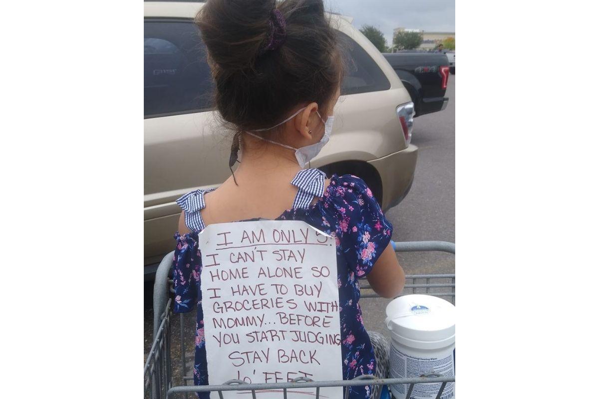 Na segunda-feira, 6 de abril, uma mãe usou as redes sociais para se explicar após sair com a filha, de cinco anos, para ir ao mercado e quebrar a quarentena. Pelo Facebook, ela publicou uma foto da menina, com um cartaz colado nas costas dela. O caso aconteceu no Texas, nos Estados Unidos.