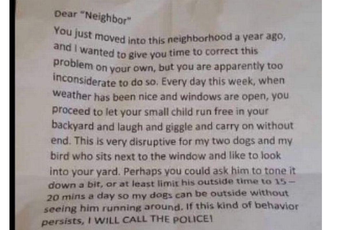 “Caro ‘vizinho’. Você se mudou para o bairro recentemente, há cerca de um ano, e eu queria te dar um tempo para você tentar corrigir o problema sozinho, mas aparentemente você não consegue fazê-lo”, começa a carta. “Todos os dias desta semana, quando o tempo está bom e as janelas estão abertas, você deixa seu filho correr solto em seu quintal e rir, rir sem parar”.