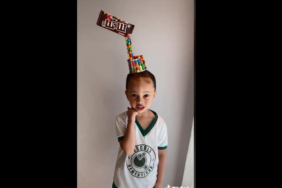 A tik toker @jubaiense se empolgou na competição da filha e fez um penteado na menina inspirado no chocolate da marca M&M’s. Em um vídeo publicado no TikTok ela mostrou como foi todo o processo de produção do cabelo da filha. A mulher colou cada pedaço do doce em uma base redonda de papelão e colocou em cima uma embalagem do doce, como se o chocolate estivesse caindo na cabeça dela. Veja a imagem abaixo: