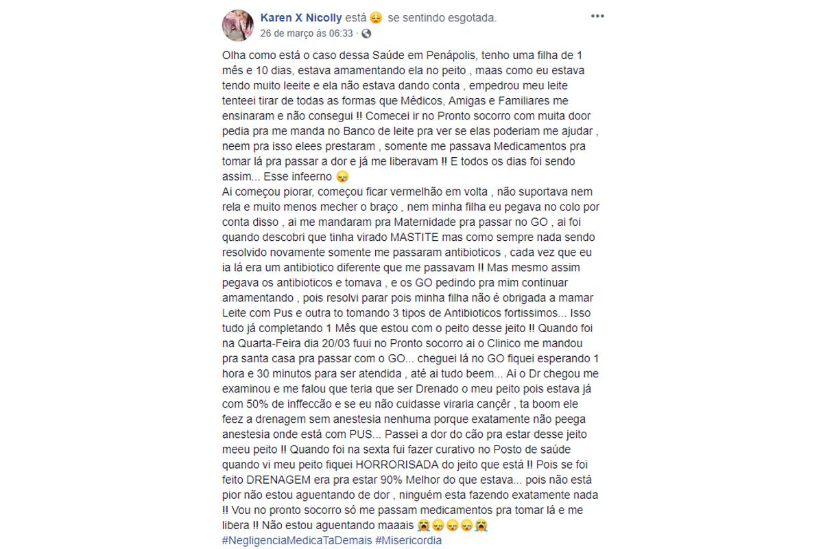 Um relato de uma mãe da cidade de Penápolis, no interior de São Paulo, vem causando comoção no Facebook. Karen, mãe de Nicolly Emanuelly, de apenas 1 mês, escreveu um texto na rede social desabafando sobre o caso de negligência médica que sofreu. “Tenho uma filha de 1 mês e 10 dias, estava amamentando ela no peito, mas como estava tendo muito leite e ela não estava dando conta, meu leite empedrou. Tentei tirar tirar de todas as formas que médicos, amigas e familiares me ensinaram e não consegui”, escreveu Karen na publicação que já soma quase 60 mil compartilhamentos.