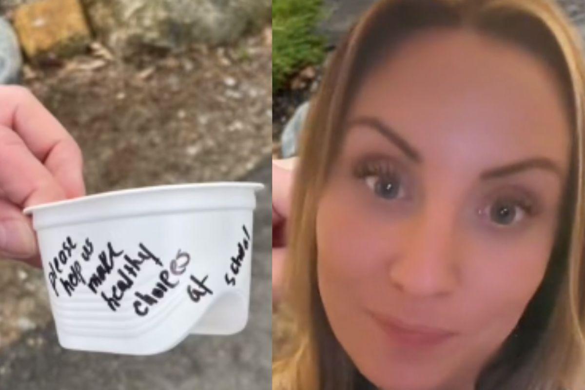 Megan, mãe de dois filhos, deixou de lanche para o filho uma porção de salgadinho. No vídeo compartilhado por ela no TikTok, ela fala sobre a nota que recebeu: “Mandei meu filho para a escola com Pringles, que é um lanche muito apropriado para uma criança de três anos”, disse ela.