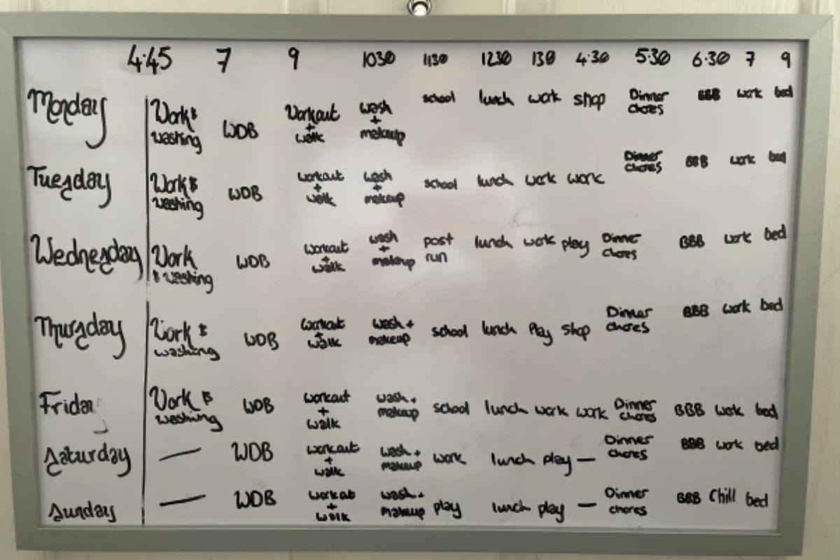 No último ano, quando o bloqueio começou, Charli estava determinada a seguir um cronograma e não se abater pela preguiça. “Elaborei um cronograma no quadro branco para o que estávamos fazendo a cada hora do dia. Também programei até 12 alarmes em meu telefone como lembretes do que fazer e quando”.
