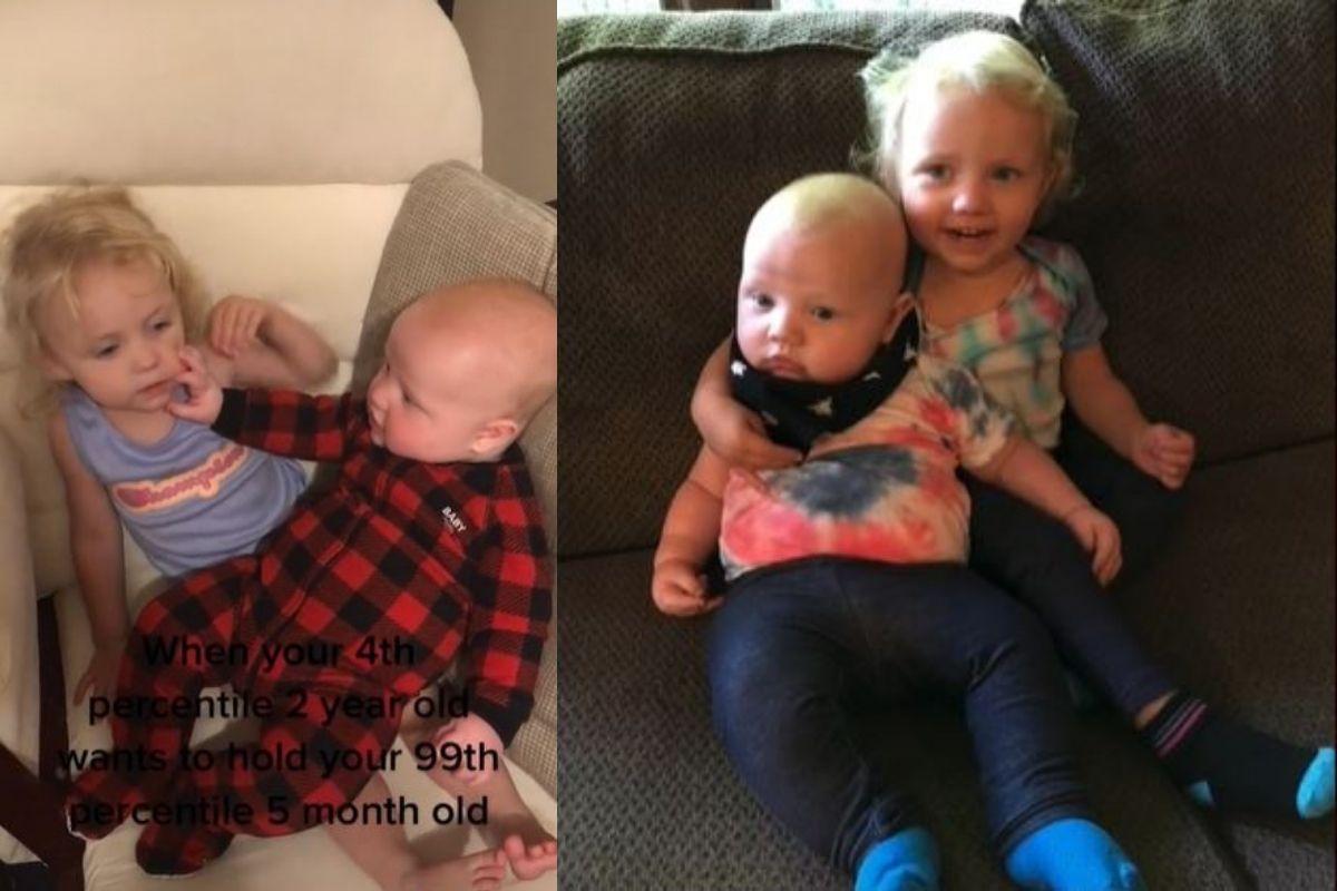 Uma mãe viralizou no TikTok ao mostrar a filha de 2 anos segurando o irmão no colo, e os dois têm o mesmo tamanho. A mãe escreveu na legenda: ““Quando seu filho de 2 anos quer segurar o de 5 meses”, e na foto se pode notar que o bebê é do mesmo tamanho que a menina.
