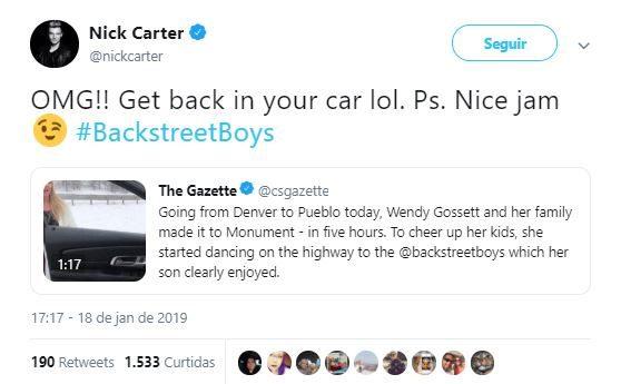 O vídeo não só viralizou como chamou a atenção de Nick Carter, membro do Backstreet Boys, que compartilhou o clipe em seu Twitter, dizendo: “Meu Deus! Volte para seu carro! Ps.: ótima música”.