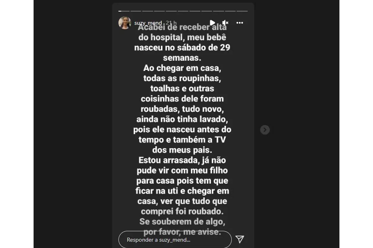 “Estou arrasada. Já não pude vir com meu filho para casa, pois teve que ficar na UTI, e chegar em casa e ver que tudo que comprei foi roubado”, publicou a mãe em uma rede social. A farmacêutica e o marido atualmente estão morando com os pais dela, mas no momento do furto não havia ninguém no local.