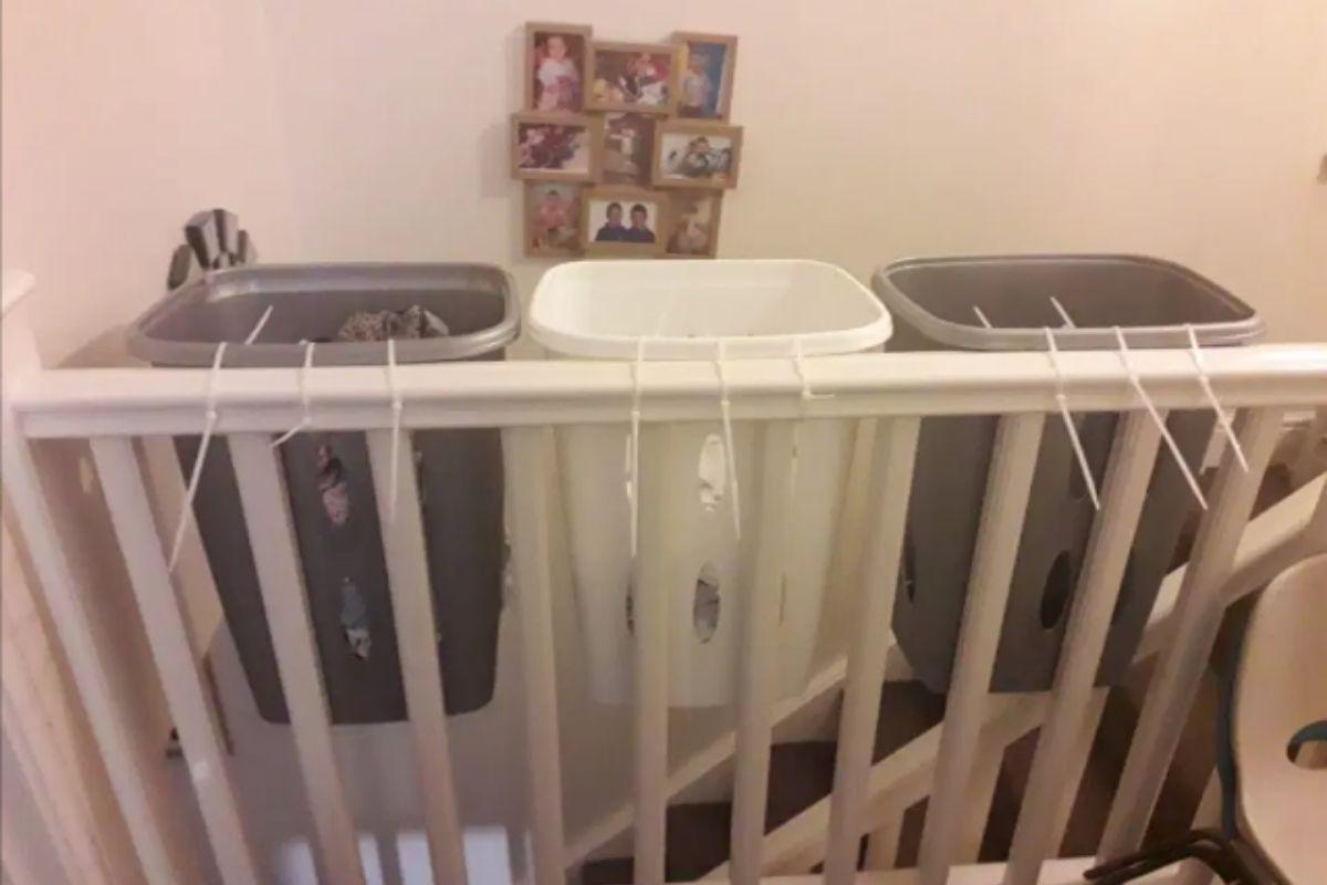 Apesar dos 3 cestos pouparem o tempo da mãe eles ocupavam muito espaço na casa pequena. Em uma foto das cestas penduradas no corrimão da escada ela resolveu: “Aí pensei em fazer isso”.