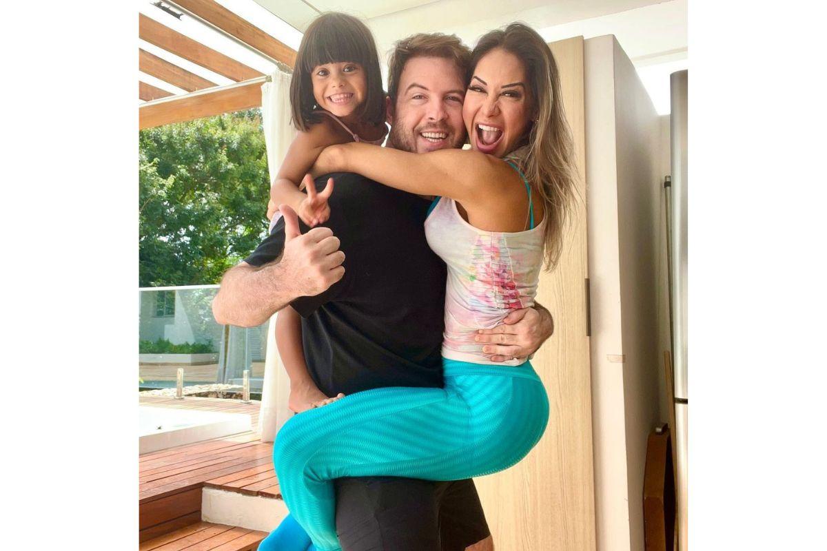 Nos registros, os três aparecem jutos, com Maíra carregando a filha nas costas e sendo carregada por Thiago. Nas fotos seguintes, Sophia está nas costas de Thiago e a mãe continua no mesmo lugar. Os três estão em casa, com roupas simples, e aparecem sorridentes para as três fotos. Na legenda, Maíra fala sobre felicidade.
