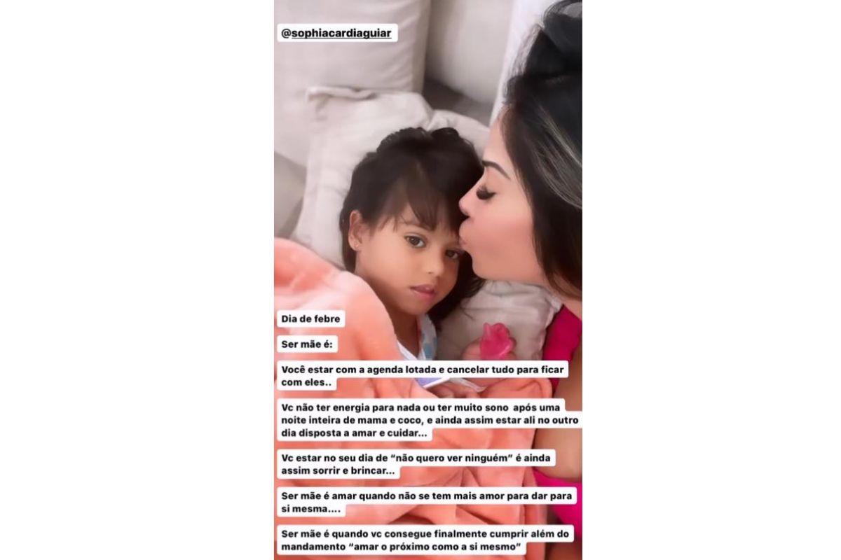 A influenciadora e coach, Maíra Cardi, usou as redes sociais na manhã desta segunda-feira, 20 de março, para falar sobre a saúde da filha dela, Sophia. A menina de quatro anos está com febre e a mãe dela postou uma foto nos stories beijando a testa da Sophia e escreveu um relato do dia. Vale lembrar que Sophia é fruto do antigo relacionamento entre Maíra Cardi e Arthur Aguiar.