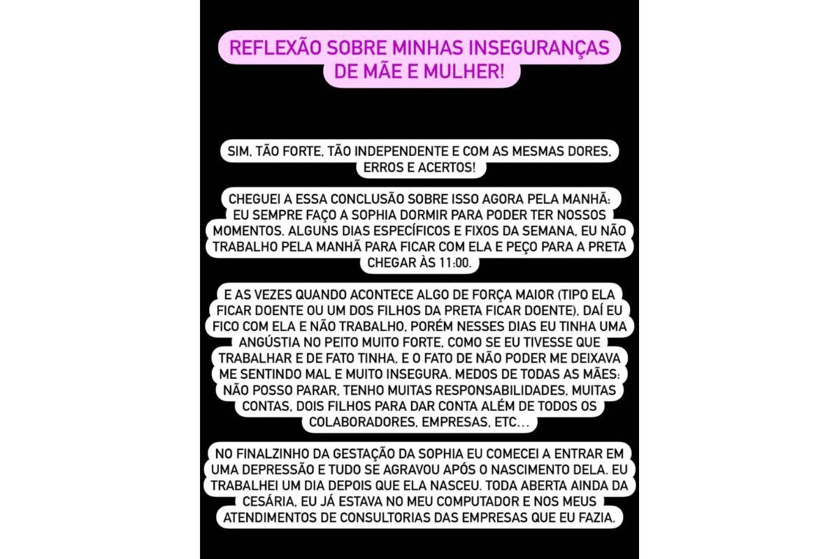 Na publicação, a influenciadora frisou que sempre foi independente. “Nunca dependi de homem para absolutamente nada. Muito pelo contrário, sempre fui a provedora e tinha até orgulho disso, batia no peito para dizer: ‘Eu sou o velho da lancha’”, escreveu. Ela ainda contou que teve depressão no fim da gravidez, e que foi criticada pela decisão de voltar a trabalhar logo após o nascimento da menina.