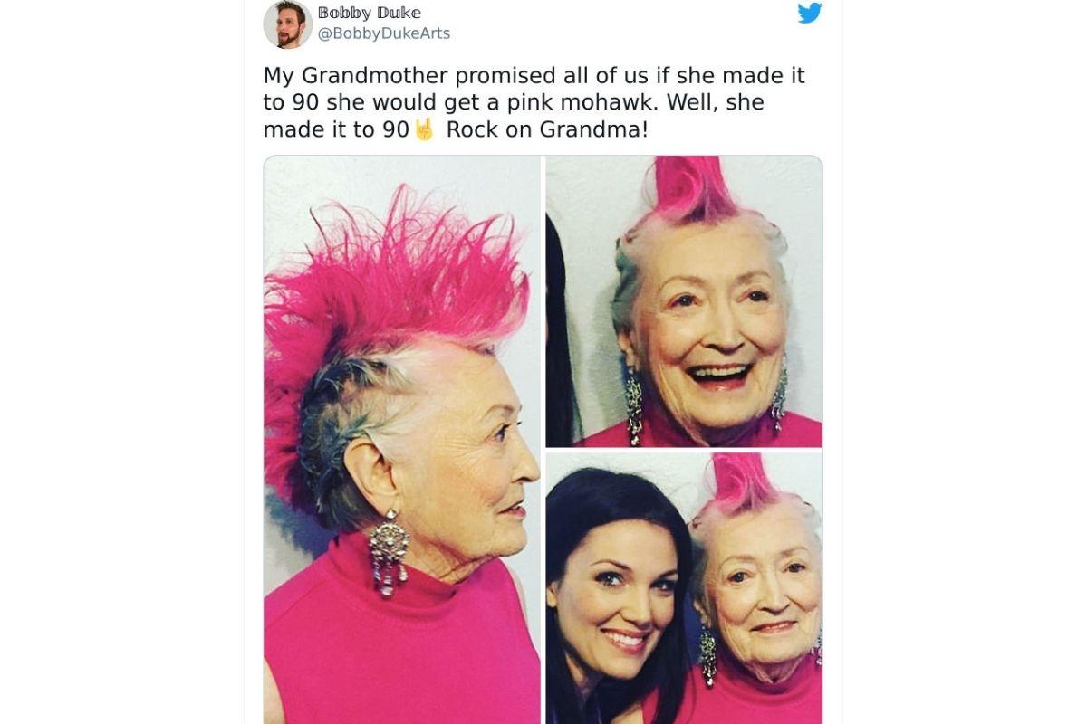 Um internauta viralizou no Twitter ao compartilhar fotos da avó, de 90 anos, usando um moicano cor-de-rosa. “Minha avó prometeu que se chegasse nos 90 faria um moicano rosa. Bom, ela chegou. Arrasou vovó!!”, escreveu o neto ao publicar as fotos dela nas redes.