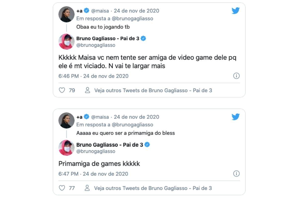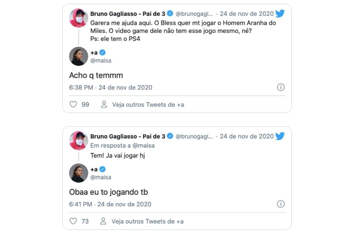 Na última terça-feira, 24 de novembro, Bruno Gagliasso pediu ajuda aos seguidores no Twitter e tirou dúvidas sobre vídeo-game que Bless quer jogar. Maisa respondeu a publicação de Bruno o que gerou uma conversa sobre o vício do menino com os jogos eletrônicos.
