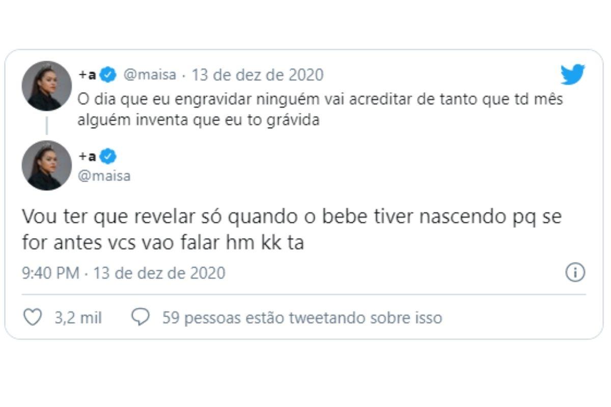 Na noite deste último domingo, 13 de dezembro, Maisa usou o Twitter para falar sobre os boatos de que ela estaria esperando o primeiro filho. De acordo com a atriz, ela não está grávida e esse rumor se tornou constante na vida dela.